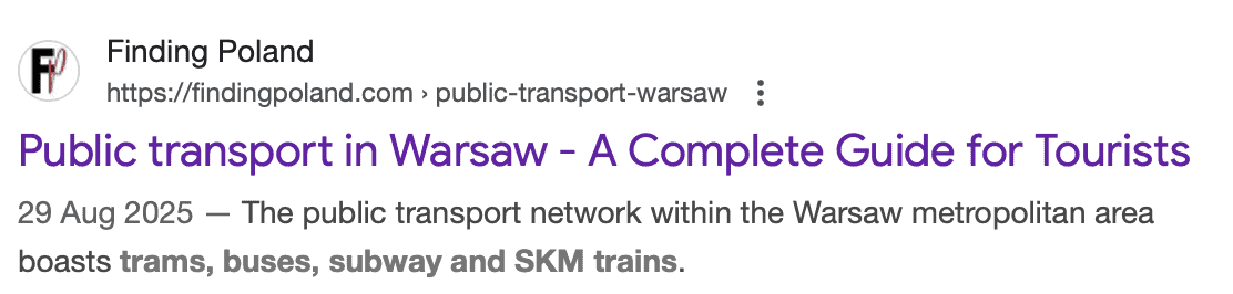My post about public transport in Warsaw was originally published on November 4, 2022. However, when I run a quick search on Google, I see “29 Aug, 2025” next to that post’s meta description. This is because I updated the post on that date and Google’s crawler picked up on this: