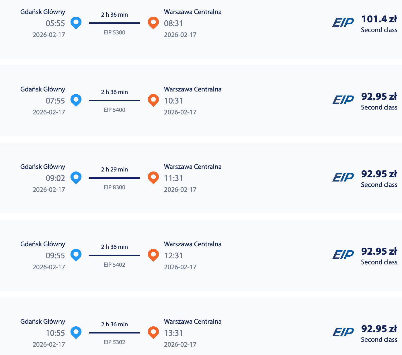 I’ve just searched Promobilet to check ticket prices from Gdańsk to Warsaw in around one month’s time. Here are five very inexpensive Promobilet offers for the morning of 17 February, 2026: